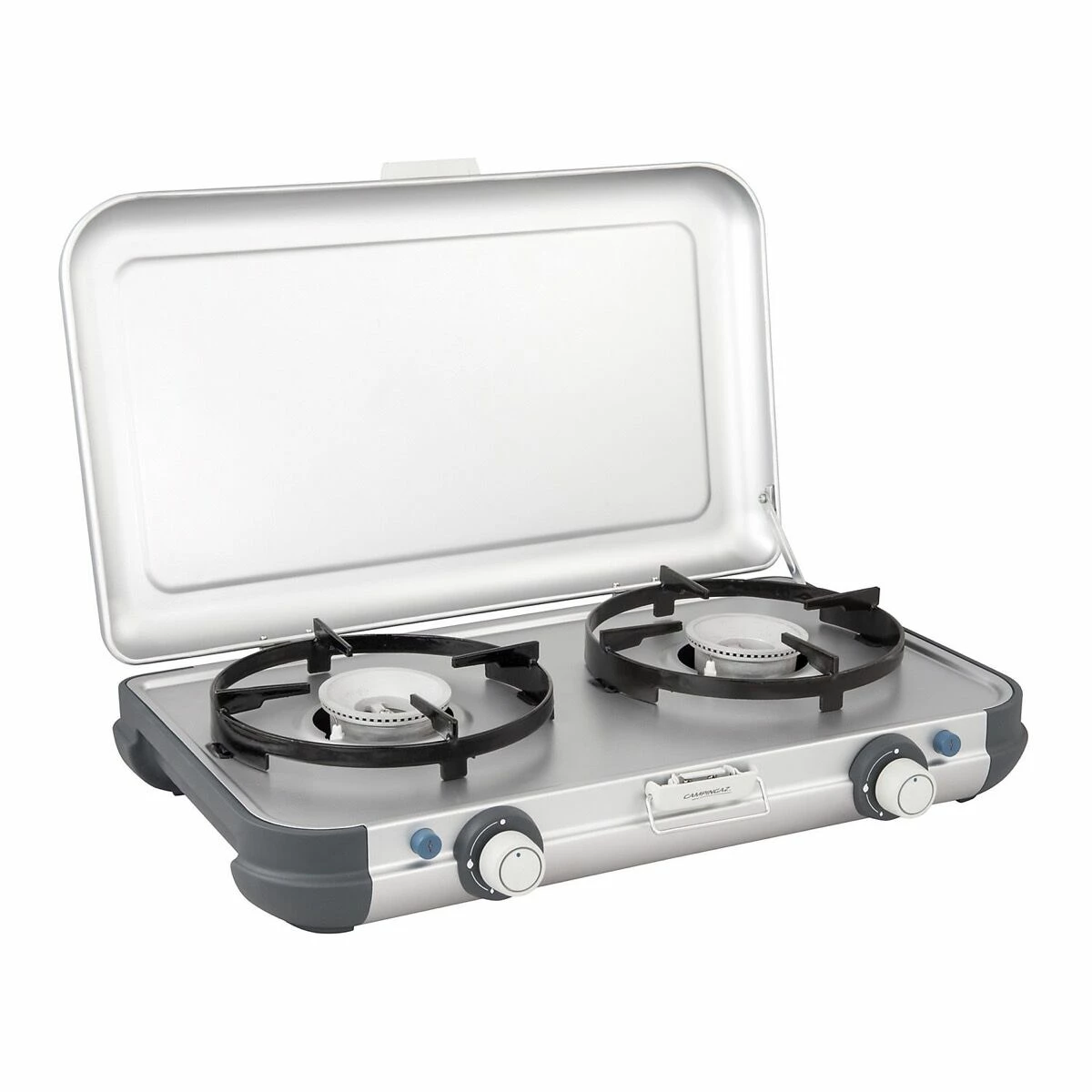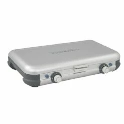 The Camping Kitchen 2 CV PZ is a compact stove, with two burners, a piezo ignition and a solid, durable design. Designed to sit inside its own carry case, the Camping Kitchen PZ is a portable cooker, working from CV 470 gas cylinders, as opposed to the larger butane bottles.