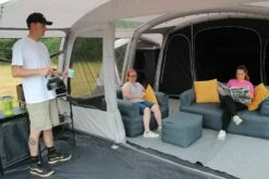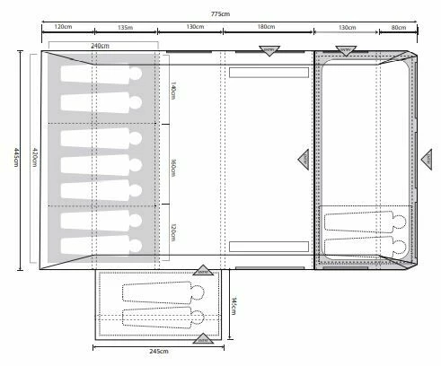 Features the ever-popular three-zone system, with a large enclosed front porch, and a sewn-in groundsheet living space complete with large, darkened inner bedrooms, which have a full 240cm depth. The 240cm depth bedrooms also offer space for camp beds and larger airbeds and have zipped dividers for differing configurations.