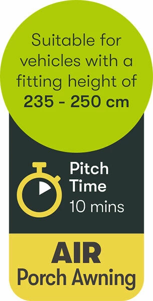 Part of the Falcon range – Introduced for 2022 is the Quest Falcon Air 390 caravan porch awning – updated to air beams for quicker pitching and features a higher grade fabric (150 Denier). Perfect for using as an enclosed seating area, space for storage, or make an extra bedroom by purchasing a pop-up inner tent. Designed to be an easy use lightweight, budget-friendly model. Fits onto a rail with a height between 235-250cm and can easily be pitched in 10 minutes by one person.