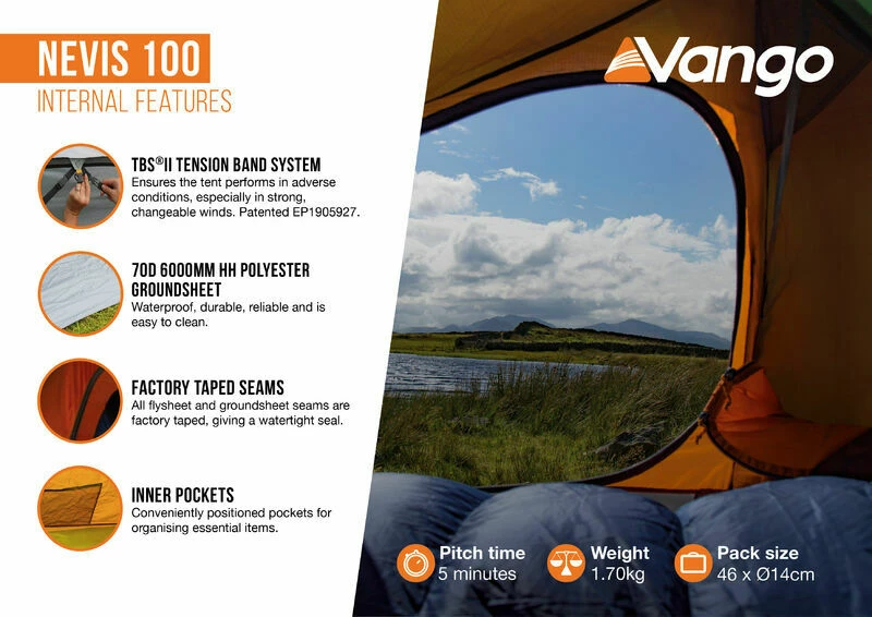Perfect for the solo camper, the Vango Nevis 100 tent is a lightweight tent ideal for backpackers, with a weight of just 1.7kg.